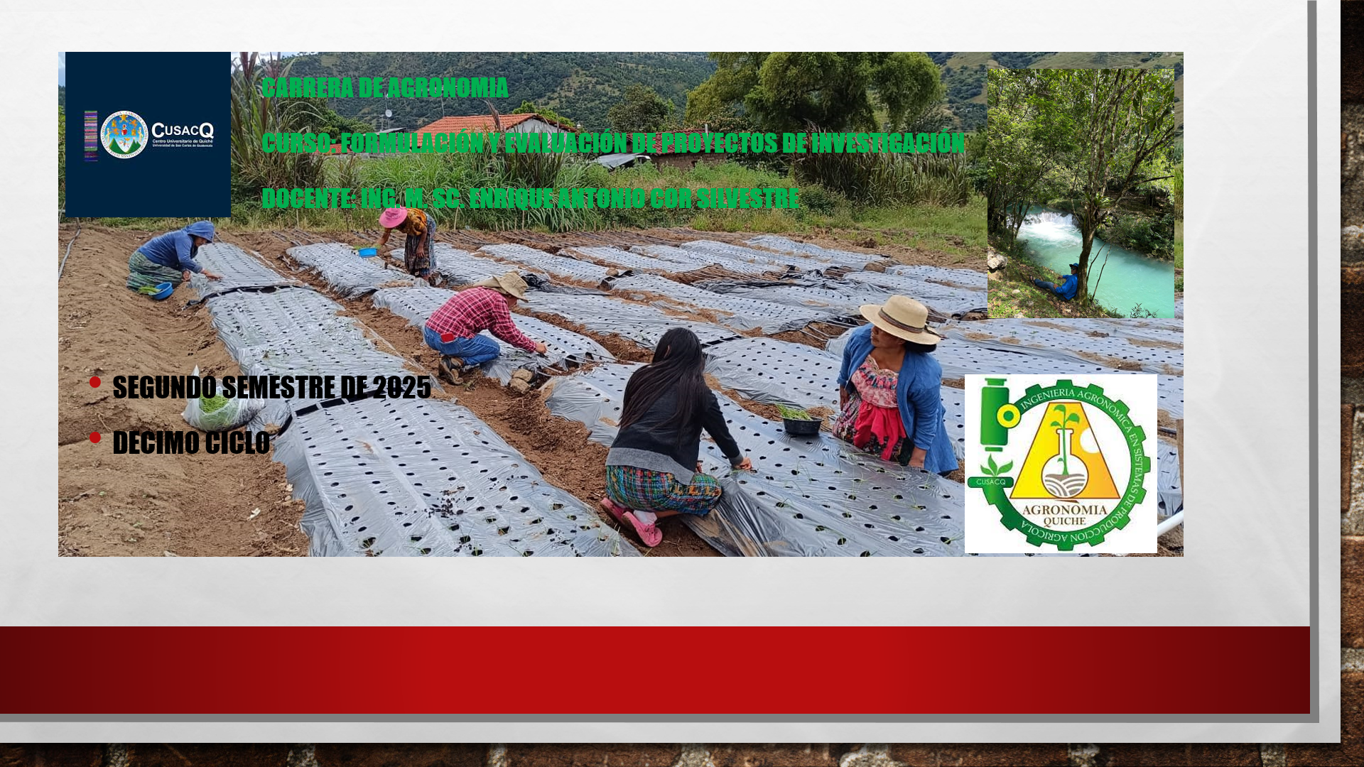 Durante el desarrollo de las actividades del Problema Especial II, no se implementarán contenidos teóricos, solo los que el estudiante considere necesarios desarrollar en actividades de integración e implementación del problema, el cual se establecerá en las instalaciones del Centro Experimental de Agronomía, ubicado en las instalaciones del CUSACQ, en la Aldea de El Chajbal, del municipio de Santa Cruz del Quiché.